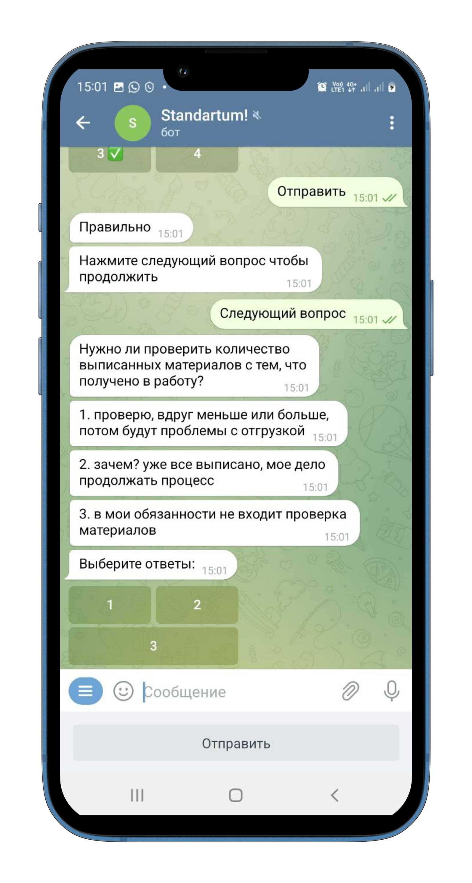 Составляется список вопросов и ответов по заданным темам. В назначенные дни сотрудник получает уведомление о тестировании. После выбора одного из нескольких вариантов ответа бот анализирует результат и дает комментарии. Варианты ответов «тасуются», а формулировки вопросов меняются, что не позволяет успешно пройти тест, не имея необходимых знаний.